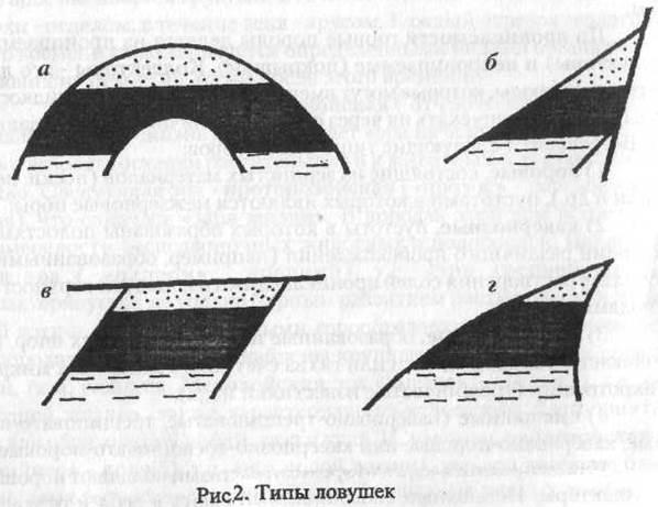 Самые распространенные типы ловушек приведены на рис.2. Наиболее распространены антиклинальные ловушки (рис. 2 а). Если в
