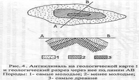 Геологическая карта - это проекция выходов горных пород на дневную поверхность. Антиклиналь на геологической карте имеет вид овального пятна, в центре которого располагаются более древние породы, а на периферии - более молодые.
