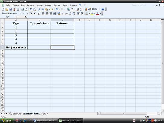 16. На рабочем листе Рейтинг MS Excel перенести таблицу Средний балл по курсам и факультету и ввести исходные данные следующим образом: