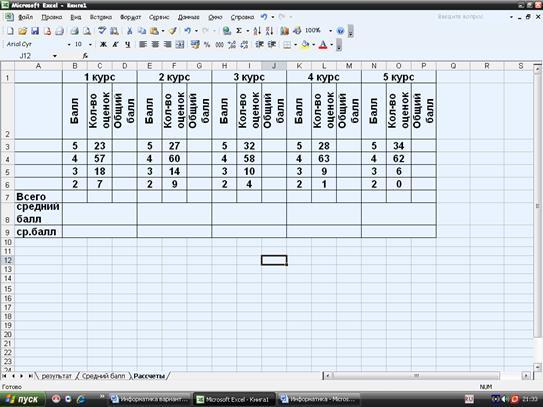 Рис.7 Расположение таблицы «Сведения о результатах экзаменационной сессии» с итогами расчетов на рабочем листе Расчеты MS Excel