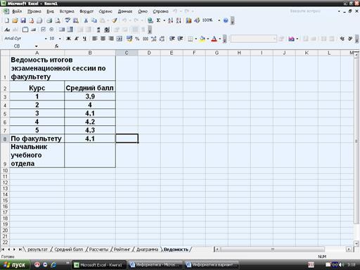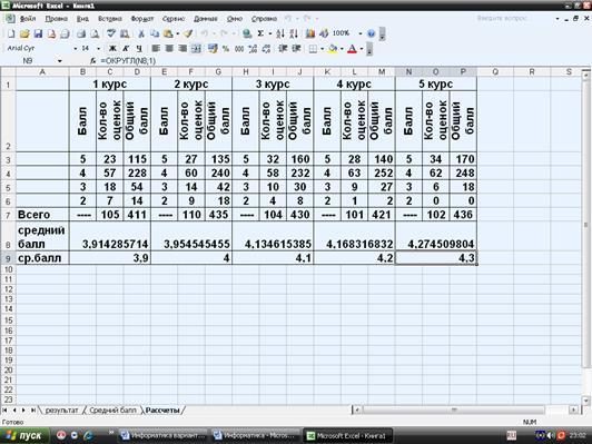 Рис. 8 Расположение таблицы «Средний балл по курсам и факультету» на рабочем листе Рейтинг MS Excel.