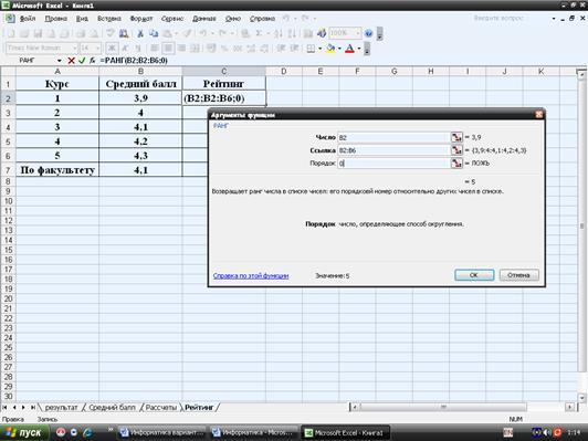 -- в строке меню выбрать Вставка – Функция – РАНГ