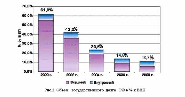 В настоящее время внешний долг РФ составляет 44,1 млрд. долларов США, что, в свою очередь, составляет 3% ВВП страны (рис. 2). Это считается одним из самых низких и лучших показателей в мире. Созданы значительные финансовые резервы, защищающие страну от внешних кризисов и гарантирующие исполнение социальных обязательств в будущем.