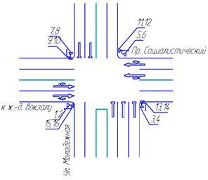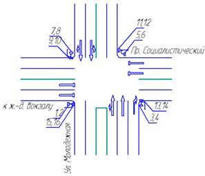 На рисунке 9 показаны число и номера конфликтных точек для первого подхода перекрестка.
