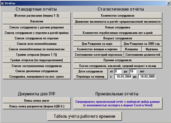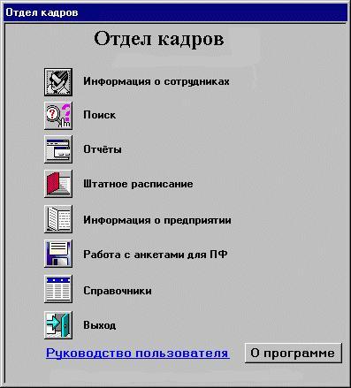 В автоматизированной информационной системе «Отдел кадров» главное меню программы выглядит следующим образом (рис. 4.13):