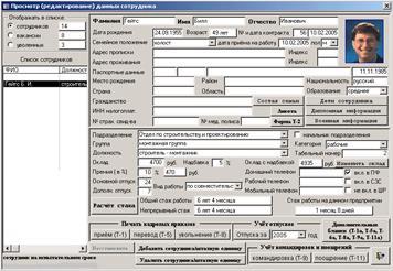 Пункт меню "Сотрудники" (рис. 4.14) предназначен для просмотра, редактирования личных данных сотрудников, а также для печати приказов. При выборе этого пункта меню открывается следующее окно: