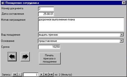При нажатии кнопки "поощрение (Т-11)" появится окно, в котором с помощью кнопок "влево" и "вправо" можно ознакомиться с историей поощрений данного сотрудника (рис. 4.23). Здесь же можно ввести информацию о новом поощрении и напечатать приказ о поощрении сотрудника: