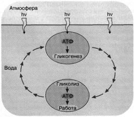 Рис. 2. Энергетика первичной живой клетки, основанная на "адениновом" фотосинтезе. Предполагается, что ультрафиолетовые кванты, достигая поверхности первичного океана, использовались клеткой для синтеза АТФ, который запускал синтез углеводородов (гликогенез). Клетка, увлекаемая потоком океанской воды с поверхности на некоторую глубину, оказывалась вне досягаемости ультрафиолетового облучения. Здесь происходило расщепление накопленных углеводов и синтез АТФ, использовавшегося для совершения клеткой различных типов полезной работы