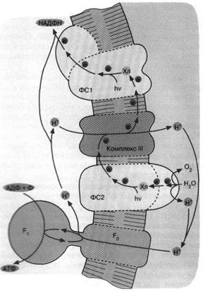 до НАДФН, которое тоже осуществляется с участием специальной энзиматической системы. Окисление воды, а также перенос электронов от ФС-2 к ФС-1 приводит к появлению разности концент-