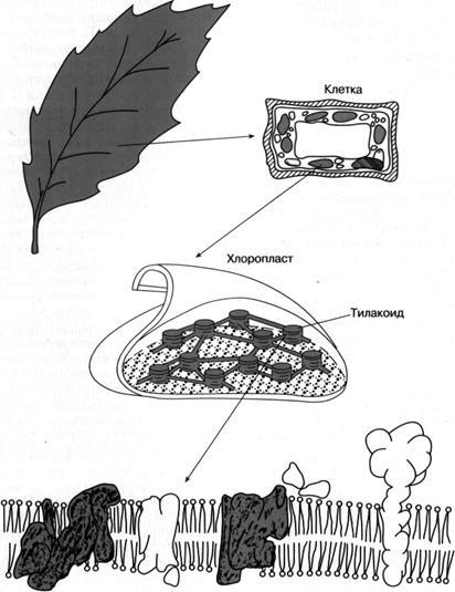 Как показано на рис. 4, хлорофилл, определяющий зеленый цвет листа растения, распределен не повсей растительной клетке, а сосредоточен в пластидах, называемых хлоропластами. В хлоропластах сосредоточен фотосинтетический аппарат, и их роль состоит в энергообеспечении клетки за счет поглощенного света. Хлоропласт имеет геном, который делится при делении хлоропласта. Несмотря на наличие собственного генома, обеспечивающего синтез большей части структур фотосинтетического аппарата, ряд строго необходимых для протекания фотосинтеза компонентов (например, основные ферменты, участвующие в биосинтезе хлорофилла, некоторые белки, входящие в систему фотосинтетического окисления воды), кодируются в клеточном геноме. Хлоропласт заполнен так называемыми тилакоидами - замкнутыми сплющенными "мешочками", которые состоят из двухслойных липидных мембран, образованных в результате впячивания внутреннего слоя двухслойной мембраны, ограничивающей весь хлоропласт от цитоплазмы. Тилакоиды сгруппированы в плотно упакованные темно-зеленые "стопки", получившие название гран, которые связаны между собой частью тилакоидов. В мембраны тилакоидов погружены белки или белковые комплексы, большая часть которых насквозь пронизывает мембрану. Только часть из этих комплексов окрашена в зеленый цвет, то есть содержит хлорофилл; было установлено, что практически весь хлорофилл находится в хлорофилл-белковых комплексах, или, лучше сказать, в пигмент-белковых комплексах, поскольку все они наряду с хлорофиллом содержат другие пигменты.