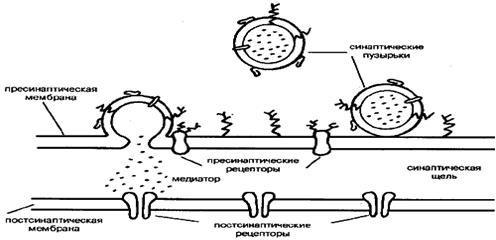 - структурные образования, накапливающие и хранящие медиатор вплоть до момента его освобождения в синаптическую щель. Мембрана синаптических пузырьков содержит разнообразные белки, предположительно участвующие в освобождении медиатора.