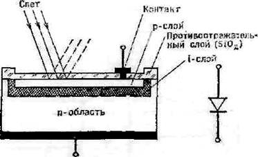 На практике чаще всего применяют pin-диоды. «Эти диоды имеют слоистую структуру (рисунок – 1.2), в которой тонкие проводящие слои pи n –типа разделены областью нелегированного высокоомного кремния (i). При попадании на pi – переход световых лучей достаточно высокой энергии (E =