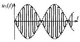 Две первые низкочастотные составляющие (1<к<<q)являются полезным сигналом управления, высокочастотная составляющая с частотой qω - помеха. Такие высокочастотные составляющие характерны, например, для сигнала, полученного в результате демодуляции после передачи его по линии связи на несущей частоте. В этом случае полезный сигнал передается как огибающая сигнала на несущей частоте. На рис.2 огибающая показана пунктиром. Она может быть выделена в результате демодуляции, а высокочастотная составляющая подавлена, однако, как правило, не до конца (рис.3). При этом уровень помехи невелик и является для полезного сигнала допустимым.