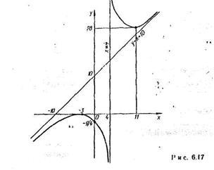 у' < 0, следовательно, функция убывает на этом интервале; в (11; +∞) у'>0, т. е. функции возрастает. В точке = 11 имеем локальный минимум: y(ll) =28.
