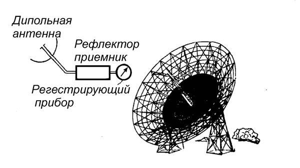 Для приема космического радиоизлучения имеются различные типы радиотелескопов. Некоторые из них напоминают рефлекторы. В таких радиотелескопах радиоволны собирает металлическое вогнутое зеркало, иногда решетчатое. Как и рефлекторов поверхность его имеет параболическую форму. Зеркало концентрирует радиоволны на маленькой дипольной антенне, облучая ее. По этой причине приемная антенна в радиотелескопах называется облучателем. Меняя облучатель можно вести радиоприем на разных длинах волн. Возникающие в облучателе токи передаются на приемное устройство и там исследуются.