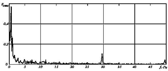 На рис. 6 показана частотна крива, що відповідає такому усередненню. З урахуванням висновку, зробленого під час розгляду рис. 5, можна сказати, що поточна частота, яка відповідає високоамплітудній низькочастотній складовій спектра коливання за час , змінюється в невеликих межах.