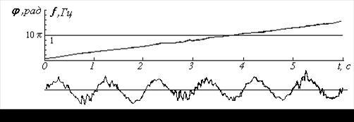 Штучна реалізація, показана на рис. 6, може служити прикладом випадкового слабкокорельованого широкосмугового процесу (на цьому рисунку і – амплітудний спектр і автокореляційна функція відповідно). Форма фазової кривої в цьому випадку складна, визначити по ній частотні характеристики процесу можна двома способами. По-перше, згладивши криву в межах відрізків часу , протягом яких відрізки кривої добре апроксимуються відрізками прямої, можна одержати значення поточної частоти процесу.