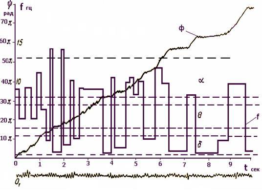 На рис. 7 наведені графіки зміни фази ЕЕГ потиличної області правої півкулі мозку здорового випробуваного. На графіку виділені (пунктирними лініями) смуги частот, що відповідають фізіологічним ритмам. Поточні частоти визначалися за фазовою кривою, отриманою при апроксимації відрізків кривої прямими лініями.