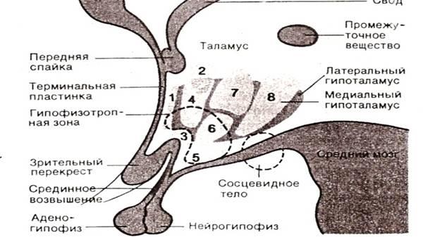 От вентромедиальной области гипоталамуса начинается ножка гипофиза, соединяющаяся с адено - и нейрогипофизом. Передняя часть этой ножки носит название срединного возвышения. В срединном возвышении оканчиваются отростки многих нейронов преоптической и передней областей гипоталамуса, а также вентромедиального и инфундибулярного ядер. Здесь из этих отростков высвобождаются нейрогормоны поступающие через систему портальных сосудов к передней доле гипофиза (аденогипофизу). Совокупность ядерных зон, в которых содержатся гормон-продуцирующие нейроны, носит название гипофизотропной области (по Р Шмидт,Г. Тевс 1996. )