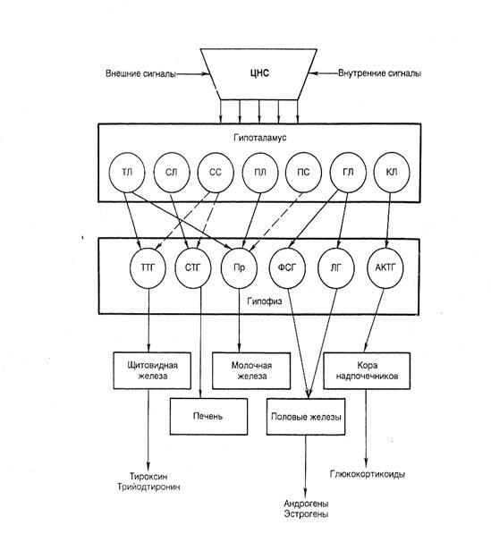 Такая регуляция постоянства внутренней среды организма, происходящая по принципу отрицательной обратной связи, очень эффективна для поддержания гомеостаза, однако не может выполнять все задачи адаптации организма. Например, кора надпочечников продуцирует стероидные гормоны в ответ на голод, болезнь, эмоциональное возбуждение и т. п. Чтобы эндокринная система могла отвечать на свет, звуки, запахи, эмоции должна существовать связь между эндокринными железами и нервной системой. Основные связи между нервной и эндокринной системами регуляции осуществляются посредством взаимодействия гипоталамуса и гипофиза. Нервные импульсы, приходящие в гипоталамус, активируют секрецию так называемых рилизинг-факторов (либеринов и статинов): тиреолиберина, соматолиберина, пролактолиберина, гонадолиберина и кортиколиберина, а также соматостатина и пролактостатина. Мишенью для либеринов и статинов, секретируемых гипоталамусом, является гипофиз. Каждый из либеринов взаимодействует с определенной популяцией клеток гипофиза и вызывает в них синтез соответствующих тропинов: тиреотропина, соматотропного гормона, пролактина, гонадотропного гормона, (гонадотропины лютеинизирующий и фолликулостимулирующий) , а также адренокортикотропного гормона (АКТГ,_ кортикотропин). Статины оказывают на гипофиз влияние, противоположное действию либеринов, подавляют секрецию тропинов. Тропины, секретируемые гипофизом, ,поступают в общий кровоток Н, попадая на соответствующие железы, активируют в них. секреторные процессы.( Рафф Г 2001).