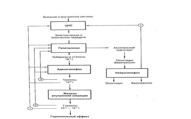Поступающие из мозга нервные импульсы гипоталамус «превращает» в эндокринные стимулы, которые могут быть усилены или ослаблены в зависимости от гуморальных сигналов, поступающих в гипоталамус от желез и тканей, подчиненных ему.