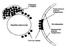 На следующем рабочем шаге с помощью другого барабана, называемого девелопером (developer), на фотобарабан наносится тонер — мельчайшая красящая пыль. Под действием статического заряда мелкие частицы тонера легко притягиваются к поверхности барабана в точках, подвергшихся экспозиции, и формируют на нем изображение. На рисунке 6 показан принцип создания копии изображения на фотобарабане.