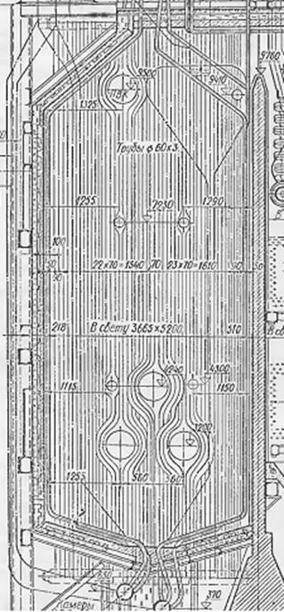 Топочная камера обьемом 144 м полностью экранирована трубами 60´3мм, расположенными с шагом 70 мм. Трубы фронтового и заднего экранов образуют под топки. Экраны разделены на восемь самостоятельных циркуляционных контуров.