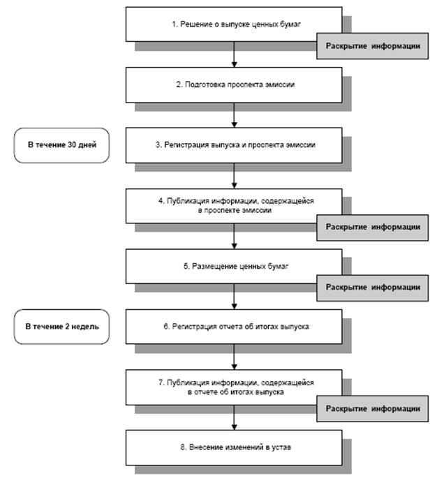 В общем случае процедура эмиссии ценных бумаг включает следующие этапы (п. 1 ст. 19 Федерального закона № 39-ФЗ):