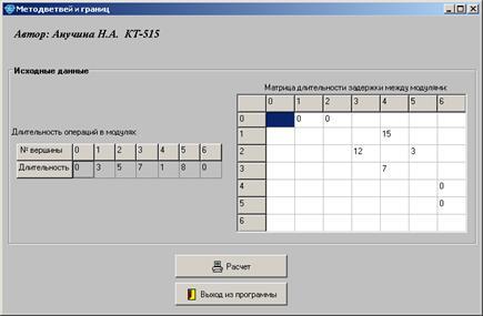 В данное окно вводятся исходные данные. При нажатии кнопки «Расчет» начинаем расчет. В итоге получаем следующее окно.
