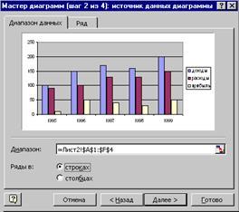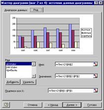 Вторым шагом в создании диаграммы является выбор данных, которые будут на ней представлены. Этот выбор уже был сделан выделением нужного диапазона перед вызовом мастера диаграмм. Если же этого не было сделано или требуется изменить сделанный выбор, то на помощь приходит окно Chart Source Data (источник данных диаграммы) мастера диаграмм (второй шаг). Это окно состоит их двух вкладок: