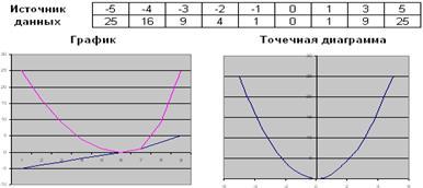Точечные диаграммы используются и в том случае, если Вы хотите построить график какой-либо неоднозначной функции или функции, аргумент которой имеет непостоянный шаг. Построим, для примера, график функции y = x2, -5 <= x <= 5. Причем от -5 до 0 представим аргумент с шагом 1, а от 1 до 5 - с шагом 2. Если Вы выберете тип диаграммы Line (График), то по оси категорий будут отложены не значения аргумента, а некоторые равные интервалы и, следовательно, график функции будет отображен неверно. Если же Вы определите тип диаграммы как XY Scatter (Точечная), Вам будет предоставлена возможность выбора значений для оси категорий, и, указав в этом качестве строку или столбец, в которых хранится ряд аргументов, Вы корректно построите требуемый график.