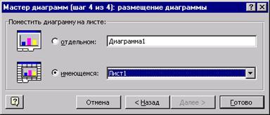) указывается, следует ли использовать для размещения диаграммы новый рабочий лист или один из имеющихся. Обычно этот выбор важен только для последующей печати документа, содержащего диаграмму. После щелчка на кнопке Готово