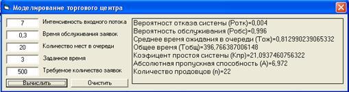 Необходимо определить количество продавцов в торговом центре, чтобы среднее время пребывания покупателей в торговом центре не превышало заданного времени. Также необходимо определить вероятностные характеристики обслуживания в торговом центре.