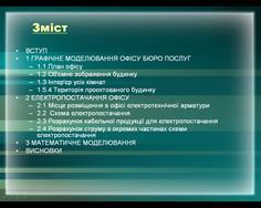 є проектування офісу за допомогою системи 3D Home Architect 8, його зовнішнього та внутрішнього виду, устаткування, схеми електропостачання та інше.