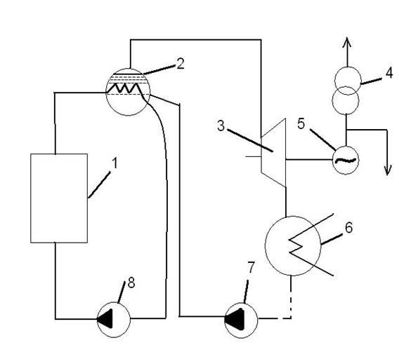 зависит от типа реактора, вида теплоносителя и замедлителя, а также от ряда других факторов. Схема может быть одноконтурной, двухконтурной и трехконтурной. На рисунке 1 в качестве примера представлена (1 – реактор; 2 – парогенератор; 3 – турбина; 4 – трансформатор; 5 – генератор; 6 – конденсатор турбины; 7 – конденсатный (питательный) насос; 8 – главный циркулярный насос