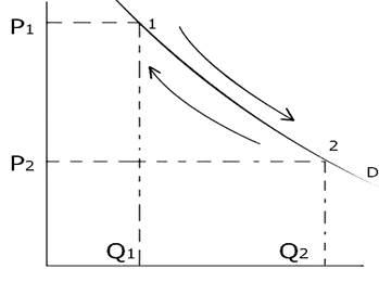 При влияние ценового фактора, изменяется величина спроса. (Движение вниз и вверх вдоль кривой D).