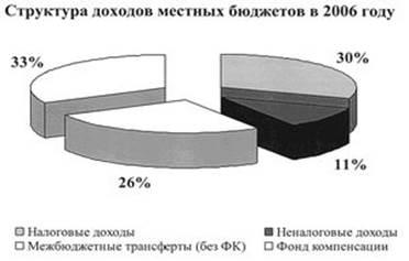 Как видно из этого рисунка доходы местных бюджетов увеличились за 2005 год на 6,9%, а расходы – на 12,5 %, что говорит о более высоком темпе роста расходов по сравнению с обеспечивающей их доходной базой. В итоге органы местного самоуправления для покрытия своих расходов вынуждены просить помощи у финансовых органов других уровней власти, такая практика превращает органы местного самоуправления в постоянных просителей. Очевидно, что для создания работоспособного местного самоуправления необходимо решить задачу финансового обеспечения этого уровня власти.