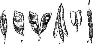 1-листовка, 2-боб, 3-боб в раскрытом состоянии, 4-стручок, 5-стручочек, 6- четкозидный стручок.