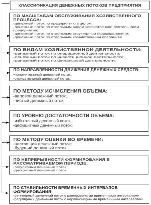 Понятие денежного потока является агрегированным, включающим в свой состав многочисленные виды этих потоков, обслуживающих хозяйственную деятельность. В целях обеспечения эффективного целенаправленного управления денежными потоками они требуют определенной классификации.
