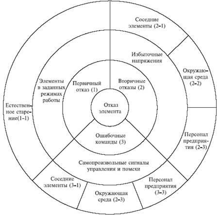 Отказы всех этих категорий могут иметь различные причины, приведенные в наружном кольце. Когда точный вид отказов определен и данные по ним получены, а конечное событие является критическим, то они рассматриваются как исходные отказы.