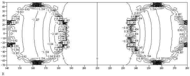 Предыдущие расчеты были сделаны для сплошных токовых поверхностей. Теперь сделаем расчет для тора, состоящего из отдельных прямоугольных витков с током (сегментированный тор) Рис.10, Рис.11. Это делается для проверки возможности воспроизведения МП сплошного тора полем сегментированных (реальных) торов. Графики – в условных единицах