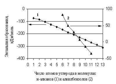 Рис. 1.1. Зависимость энтальпии образования н-алканов и алкил бензолов от числа атомов углерода в их молекулах