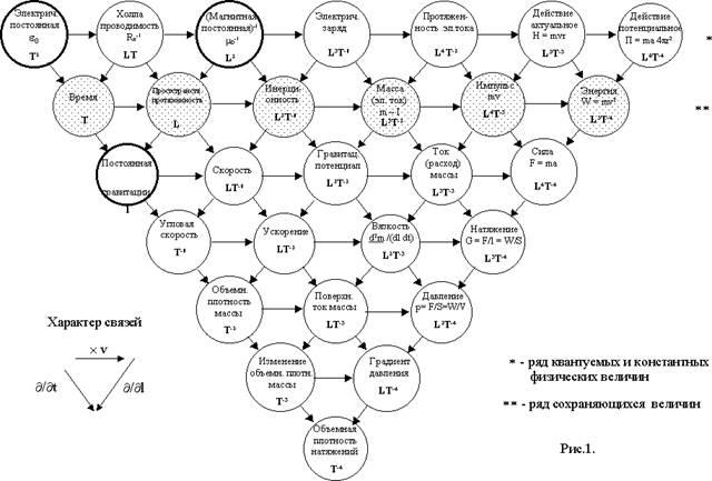 , приводит к выявлению естественного и красивого расположения важнейших физических величин в определенной системе. Эта система представлена на рис.1. В этой системе присутствует один из самых главных и примечательных системных признаков - свойства элементов определяются их местоположением в системе.