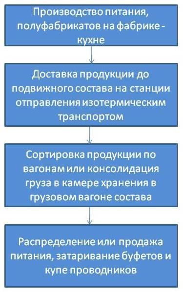 Технология производства, регенерации и подачи горячих блюд Большинство on-train кейтеринговых компании в мире принадлежат самим перевозчикам. Питание организуется двумя способами. VIP - обслуживание осуществляется с использованием заготовок, полученных с фабрики - кухни на точке загрузки вагон - ресторана и по технологии «из под ножа». Комплексные рационы приготавливаются на фабрике - кухне и загружаются в специальные холодильные отсеки купе проводников или в специальный полу - вагон (часть грузового вагона), оснащенный среднетемпературной или низкотемпературной камерой. Обслуживание пассажиров проводниками осуществляется методом разноса разогретой регенерированной в пароконвектомате или небольшой портативной конвекционной печи еды по купе на подносах. В сидячих вагонах еда развозится по принципу бортового питания. В буфетах поездов предлагаются как снеки, напитки , так и готовые обеды - приготовленные по технологии cook&chill и упакованные в ланч - боксы или лотки в защитной атмосфере. VIP - обслуживание пассажиров зачастую отдается на откуп профессиональным кейтеринговым компаниям, которым выделяется часть вагон - ресторана на правах аренды.