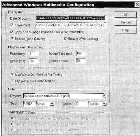 Без этого этапа просто невозможно обойтись. Правда, при начальной установке программа должна сама производить все необходимые настройки. Но не все может получиться (как по Вашей вине, так и по вине программы), поэтому не исключено, что, загрузив файл с примером совместного использования MIDI и цифрового звука (например, Riff Funk Audio and MIDI Demo), вы не услышите либо MIDI, либо цифровой звук, либо и то, и другое. Но не стоит огорчаться, дело житейское, сейчас мы с вами все настроим.