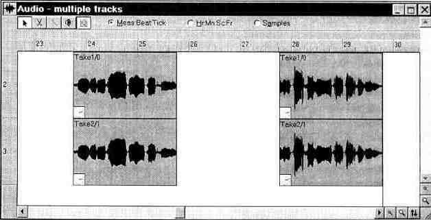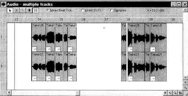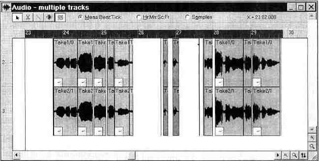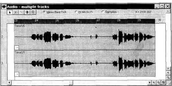 Теперь перед вами материал, с которым можно работать. Если какая-то из фраз песни спета немного раньше или позже, чем положено, то самое время устранить эту очень маленькую погрешность. Выделите сообщения, относящиеся к фразе, спетой не вовремя, и с помощью мыши переместите их на новое место (правее — значит позже, левее — раньше). Прослушайте результат. Не совсем то, что хотелось? Попробуйте еще.