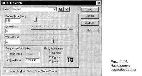 Окно диалога для задания параметров реверберации показано на рис. 4.14.