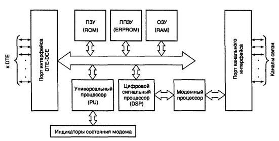 универсального (PU), сигнального (DSP) и модемного процессоров; постоянного (ПЗУ, ROM), постоянного энергонезависимого перепрограммируемого (ППЗУ, ERPROM) оперативного (ОЗУ, RAM) запоминающих устройств и схемы индикаторов состояния модема.