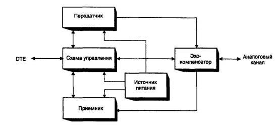 В самом общем виде синхронный модем содержит приемник, передатчик, компенсатор электрического эха, схему управления и, возможно, источник питания (рис. 2. 2). Схема управления, как правило, исполняется в виде микропроцессора универсального назначения (PU на рис. 2. 1), и предназначена для обеспечения интеллектуального интерфейса с DTE и управления работой приемника, передатчика и эхо-компенсатора.