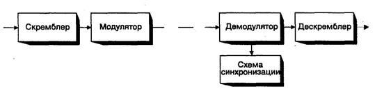 Приемник типового синхронного модема в свою очередь содержит адаптивный эквалайзер со схемой управления, модулятор с задающим генератором, демодулятор, относительный декодер, дескремблер и схему синхронизации (рис. 2. 4).